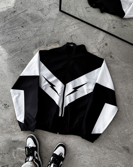 جاكيت الصاعقة لون اسود وابيض قماش مطري خفيف ✅