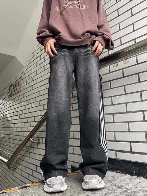 بنطرون جينز سحاب مخطط اسود وازرق *