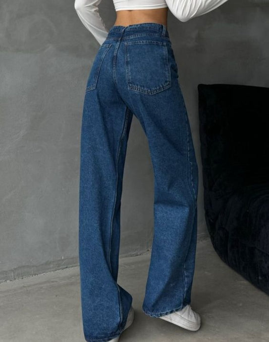 بنطرون جينز ازرق بخصر عالي وواسع