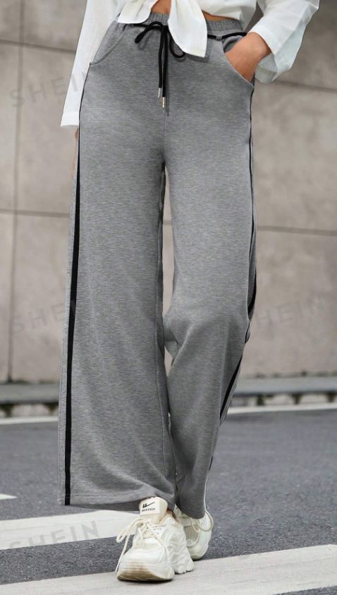 بجامة رصاصي خط اسود خصر لاستيك , قطني, قالب طبيعي
