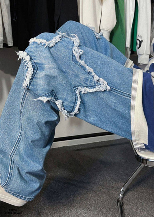 بنطرون جينز ازرق بخصر مرتفع مطرز نجوم ,قالب طبيعي