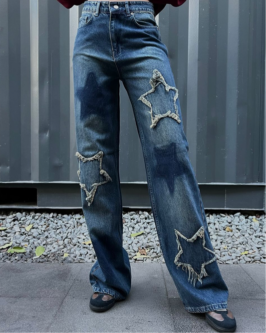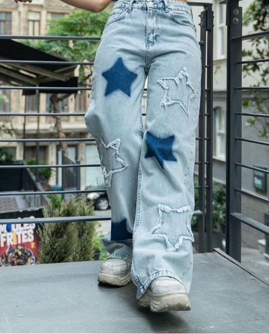 بنطرون جينز ازرق بخصر مرتفع مطرز نجوم ,قالب طبيعي