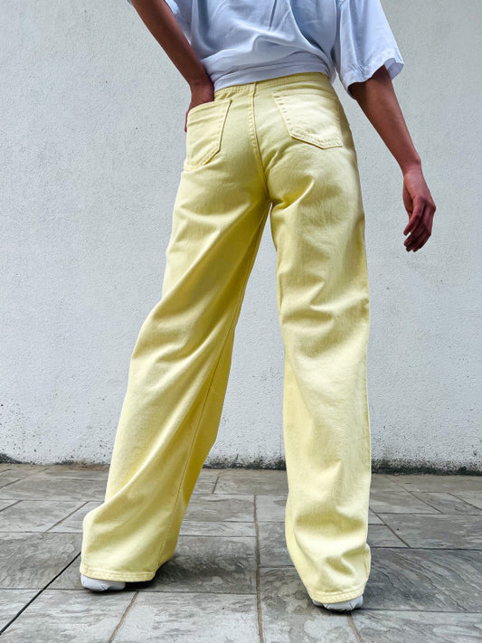 بنطرون عريض سادة نسائي اصفر , قالب طبيعي