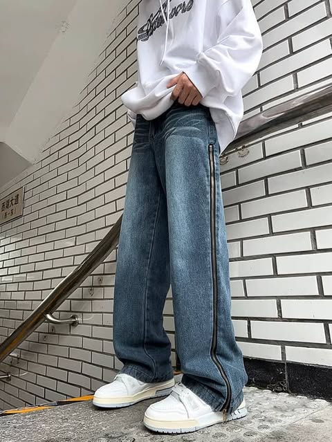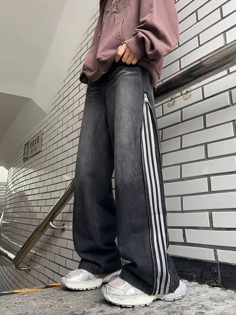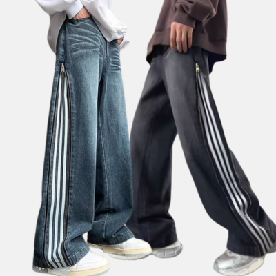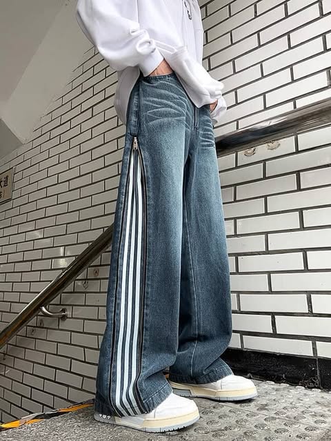 بنطرون جينز سحاب مخطط اسود وازرق *